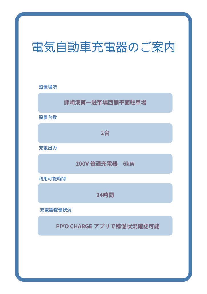 ホーム > ニュース > EV充電器設置のお知らせ 2025年12月7日 Topics EV充電器設置のお知らせ 現在、当施設ではEV充電器の設置準備を進めております。設置が完了次第、改めて皆さまにお知らせいたします。 現在、当施設ではEV充電器の設置準備を進めております。設置が完了次第、改めて皆さまにお知らせいたします。